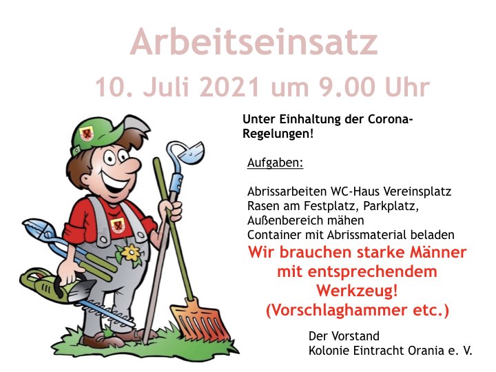 Liebe Gartenfreunde, am 10.07.2021 um 9 Uhr ist unser nächster Arbeitseinsatz. Da es sich um Abrissarbeiten handelt, brauchen wir wieder starke Männer mit entsprechendem Werkzeug.
