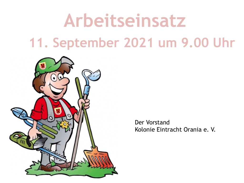 Liebe Gartenfreunde, nächsten Samstag, 11.09.2021 um 9 Uhr ist unser nächster Arbeitseinsatz. Es gibt alles Mögliche zu tun, jede helfende Hand ist willkommen;)
