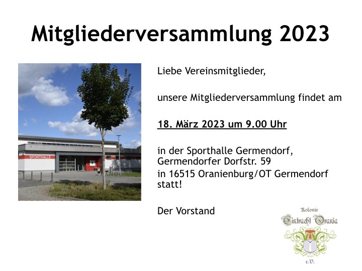 Liebe Gartenfreunde, und nochmal: am Samstag, 18.03.2023 um 9 Uhr findet unsere diesjährige Mitgliederversammlung in der Sporthalle Germendorf statt. Wir bitten um zahlreiches Erscheinen. Nur wer dabei ist, kann auch Gebrauch von seinem Mitbestimmungsrecht machen!