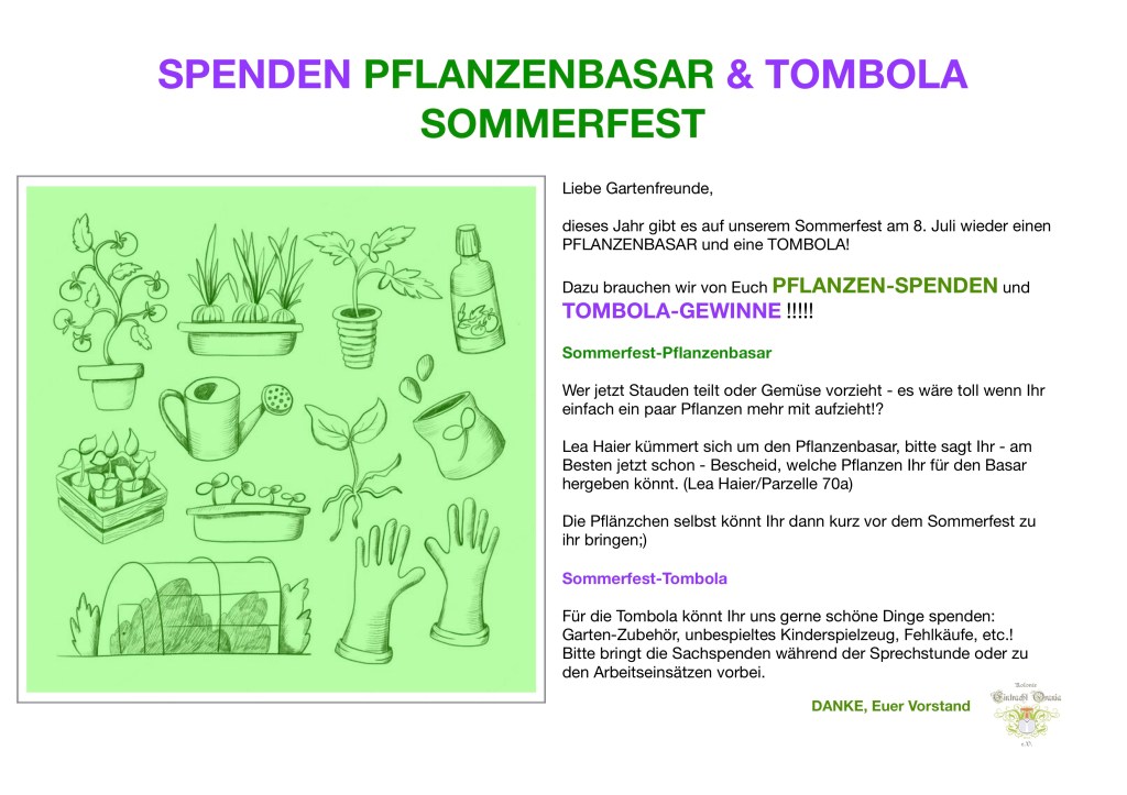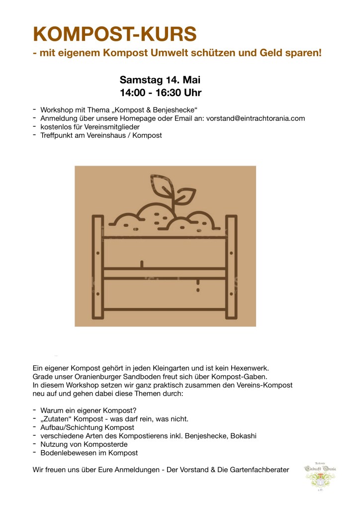 Liebe Gartenfreunde, endlich Mai, endlich Frühling!!!!! Unser Sommerfest naht, am 8. Juli – Termin bitte vormerken. Wir brauchen Pflanzenspenden und Tombolapreise von Euch. Am Samstag 14. Mai ist der nächste Arbeitseinsatz am Vereinshaus von 9 – 12 Uhr. Fast direkt danach beginnt um 14 Uhr ein spontan geplanter Kompost-Kurs für unsere interessierten Vereinsmitglieder. Bitte merkt Euch auch unbedingt die Termine für die Gartenbegehung am 3.6. und 10.6. schonmal vor. Und bitte schaut Euch doch mal wieder die Eintracht-Orania-Gartenordnung durch, damit es weiterhin gut mit den Nachbarn klappt…wir wünschen Euch einen super Start in die Gartensaison 2023!