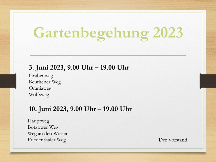 Liebe Gartenfreunde, die Gartenbegehung 2023 findet diesen und nächsten Samstag statt! Wir freuen uns, wenn Ihr uns die Arbeit erleichtert, indem Ihr in Euren Gärten auf uns wartet – Danke!