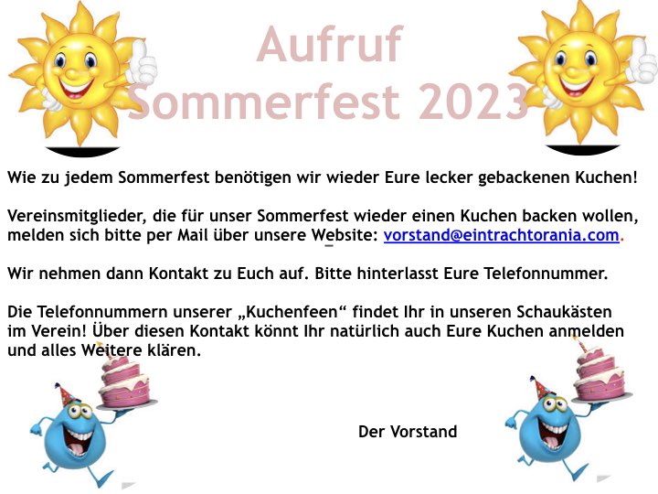 Unser SOMMERFEST naht – am 8. Juli um 15 Uhr öffnet der Festplatz das Garten-Tor;) Es können immer noch Pflanzen für den Pflanzenbasar bei Lea und Gewinne für die Tombola beim Vorstand abgegeben werden! Wer einen Kuchen backen möchte, meldet sich bitte am Besten per Email bei uns: