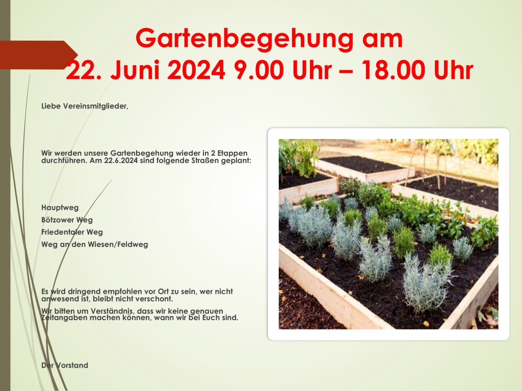 Liebe Gartenfreunde, die Gartenbegehung steht vor der Tür;) Am Samstag 15.6. kommen wir von 9 – 18 Uhr im Grabenweg, Beuthner Weg, Oraniaweg und Wolfsweg vorbei. Am Samstag 22.6. dann Haupweg, Bötzower Weg, Friedenthaler Weg und Weg an den Wiesen/Feldweg. Bitte erleichtert uns die Arbeit, indem Ihr an dem jeweiligen Tag einfach vor Ort seid und uns Euren Garten zeigt!