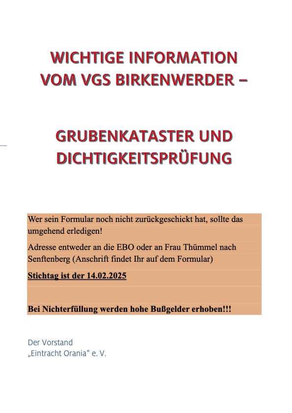 Liebe Gartenfreunde, erstmal noch Frohes Neues Gartenjahr Euch allen!!! Achtung – WICHTIG – bis 14.02.25 müssen alle Formulare bezüglich Dichtigkeitsprüfung zurückgeschickt sein !!! Unsere Vereins-Termine für das Gartenjahr 2025 findet Ihr weiter unten im Newsletter!